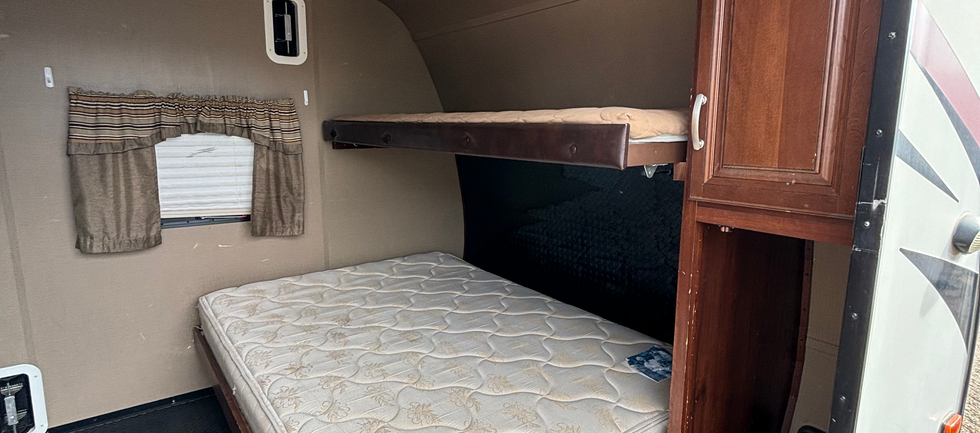 This Toy Hauler is great for anyone wanting to bring their motorcycle or bikes along on their trip. There is a full bunk with a twin on top in the garage area. You have a foldout couch and dinette for extra sleeping as well. Full bathroom and full kitchen will let you cook anything you want. In the rear is a king bed.